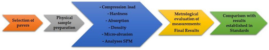 To obtain specimens for essays, 10 interlocking pavers were chosen at random from a batch produced in CRC “Programando o Futuro”. The specimens have been produced in dimensions accordingly the Standards. Essays were defined from the materials’ predetermined applications: resistance to compression load, surface hardness, medium absorption, medium density, resistance to micro-abrasive wear, and study of surface topography and phase contrast by SPM—Scanning Probe Microscopy. The flowchart of the essays is depicted in Figure 2.