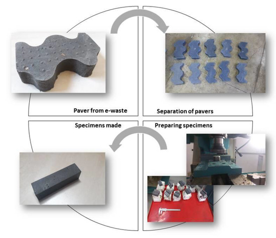 According to the annual report of the ABRIN—Brazilian Association of Recycling and Innovation, 986 t of computer equipment discarded by the Brazilian federal government were processed by the CRC’s in 2017 [16], 36% of which consists of CPUs, 4% of notebooks or laptops, 24% of monitors, 10% of printers, 25% of other IT—Information Technology items, and 1% of IT furniture [22]. The CRC “Programando o Futuro” of Valparaíso/GO produces interlocking plastic pavers from housings and plastic components. These pavers can be used for applications on floors, walkways, elevated walkways, and parking. Figure 1 illustrates the pavers’ production flow and its application.