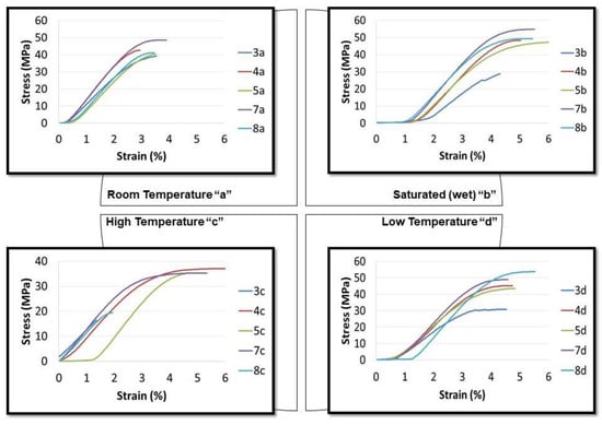The stress versus strain curves showed features of essays on polymers, with a linear relationship between stress/strain in some interval, which allows the evaluation of Young’s module. The value is within the expected parameters for polymers, even for specimens treated at high temperatures, low temperatures, and saturation. As we have described above, five specimens have been tested for each essay. Figure 5 shows the stress-strain results for each essay. Results for saturated specimens, as well those for high temperatures, showed significant dispersion. The essay at room temperature showed lower dispersion, as shown in the uncertainty value presented in Table 1.