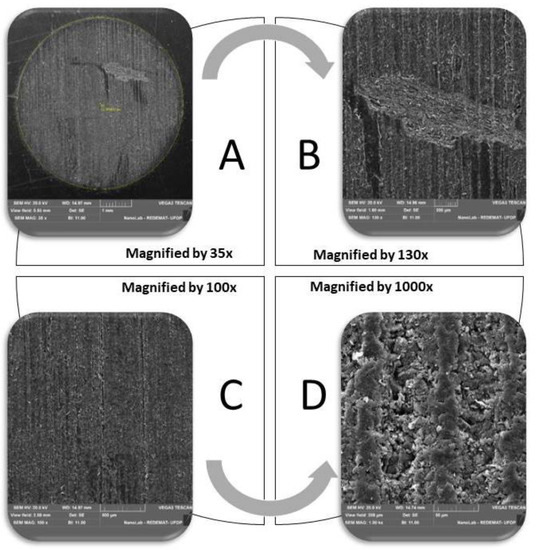 Magnified by (A) 35×, (C) 100×, (B) 130×, and (D) 1000×. Evaluation of micro-abrasive wear in inclusions using the SEM technique.