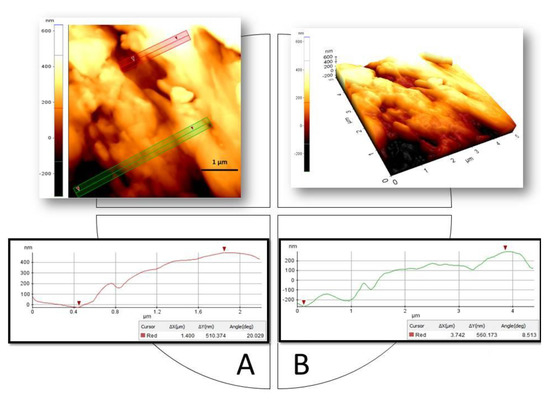 Topographic images of the Atomic Force Microscope (AFM) in trace of the probe. At left viewpoint vertical to the image and, at right, and oblique view. The two plots below show topography for two regions: (A) refers to the red scale of the image, and (B) refers to the green scale of the image.