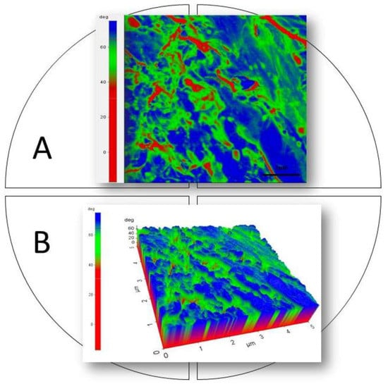 The mode used in this test was Tapping (Intermittent contact), because the soft material with energy dissipation favors the distinction between attractive and repulsive regimes for image generation. According to [39], AFM can distinguish the different modules of elasticity of the constituent materials even though there is no difference in the sample’s topography. This is thanks to the AFM needle that vibrates on the sample and detects the material’s ability to absorb the energy of the shock with the needle. As the sample was manufactured from materials already processed, this mode will bring morphological and topographic information after reproducing the specimens’ polymers.