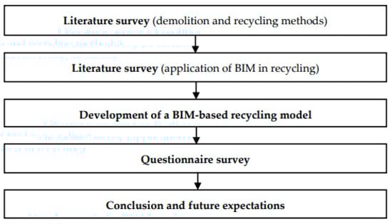 Under these circumstances, there is a great demand for waste recycling of building materials in China; the economic and environmental benefits gained from recycling are enormous [], and recycling is now seen as a solid waste management strategy []. In the last decades, building information modelling (BIM) has received rapidly increasing attention from both academics and the construction industry globally []. The application of BIM technology covers many aspects of a building project, including building design, cost estimation, 3D coordination, facility maintenance, and building performance analysis []. In some countries, the feasibility of applying BIM in the deconstruction or demolition phase and recycling of construction materials has been proved in many studies [,,,,]. According to Spisakova and Mandicak [], more efficient construction and demolition waste (CDW) management and minimization can be achieved through BIM; besides this, a more specific estimation of recyclable materials can also be realized. However, all the research in this field has been confined to a certain stage, not the whole life cycle of a construction project. Meanwhile, almost all this research is only conceptual, without any specific implementation plan or framework.