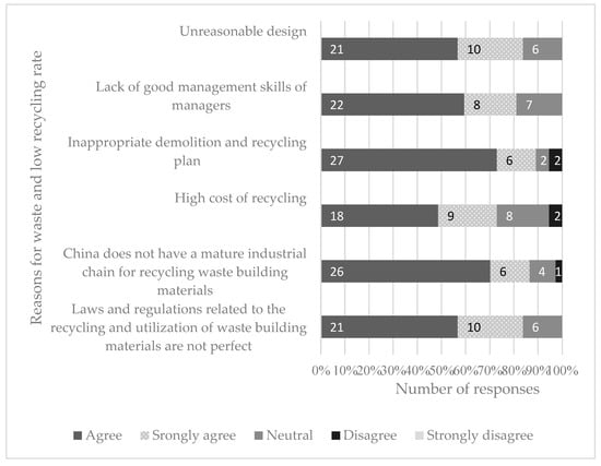 As shown in Figure 3, landfill is the most common method, and the adoption of recycling in the disposal of building materials is relatively low. This also confirms the research result from Luo et al. that in China, the most common method of dealing with waste is to bury it []. Then what causes the low recycling rate (5%) of construction materials in China? Participants were asked to rank their degree of agreement or disagreement with the reasons listed in Figure 4. It is noticeable that the top two reasons were