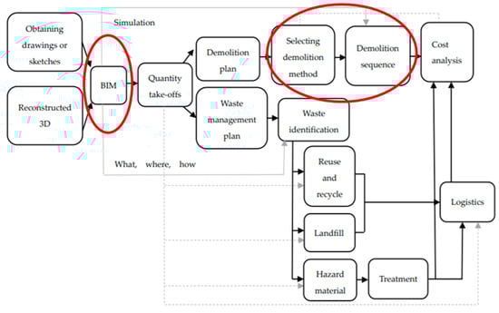 Figure 5 shows the developed deconstruction and waste management process proposed by Ge et al. [], which is an improvement on the traditional demolition and recycling plan. However, in this model, BIM is only applied to buildings that did not use BIM during construction to classify materials, which is not enough to optimize the recycling plan for construction materials.