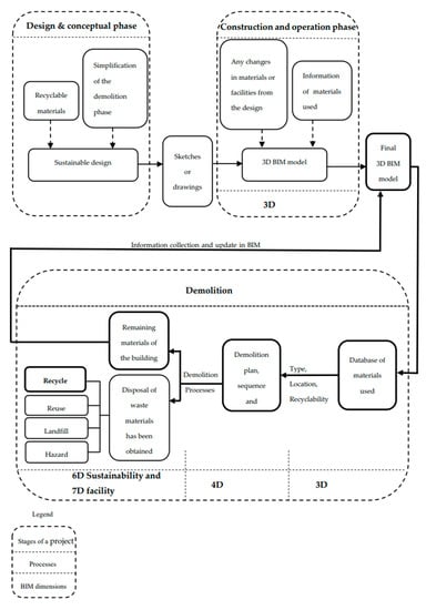 Through comprehensive consideration of the literature findings and the results of the questionnaire, for the purpose of improving the current situation of serious building material waste and low material recovery rates, one developed model for building material recycling is proposed as follows. This model combines three dimensions of BIM: 3D modelling, 6D sustainability, and 7D facility management [].