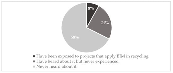 First of all, almost 68% (Figure 7) of the respondents have never heard about adopting BIM in construction material recycling. Furthermore, from the questionnaire results, only 8% of participants had been exposed to projects that implemented BIM in recycling, showing that the application of BIM has not yet reached the demolition phase, especially the recycling of building materials. It is valuable to bridge the gap between China and other countries like Singapore, where the use of BIM for material recycling at the demolition phase is already in place [].