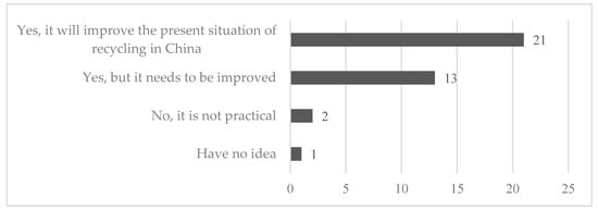 In the last three questions in this questionnaire, respondents were asked to give their comments on the proposed recycling model, which had been introduced to them in detail. The results, as demonstrated in Figure 8, show that this model obtained approval from 92% ((21 + 13)/37) of the participants. Among these 34 people, 62% (21/34) thought that this model is feasible in real construction projects and will improve the present situation of building material recycling in China, while in the opinion of the other 38% of respondents, this is a viable model but still needs to be improved.