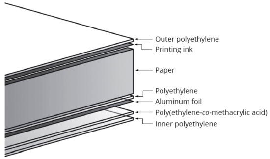 The typical structure of an aseptic carton is shown in Figure 1. An LDPE (low density polyethylene) outer layer provides a moisture barrier, protects the printing ink layer applied to the paperboard and enables the package flaps to be sealed. The type of paperboard used depends on the product being packed, the regional market where it will be sold and the manufacturing conditions, but it is commonly a duplex or triplex material with a bleached or clay-coated outer layer and often contains CTMP (chemithermomechanical pulp); the paperboard gives the package the required mechanical rigidity and typically represents 75% of the total weight of the package. As there is no contact between the paperboard and the liquid product inside the package, no wet-strength additives are used in the paperboard. The inner side of the paperboard is coated with LDPE to tie it to the aluminum foil (generally 6.35 µm thick and constituting 5% of the total weight of the carton) that provides an odor, light, and gas barrier. Adhesion of the aluminum foil to the innermost plastic layer is achieved through the use of a layer of EMAA (poly(ethylene-co-methacrylic acid) which has rheological properties similar to those of LDPE [2,3]. Finally, an inner layer of LDPE is applied to enable heat sealing of the carton.