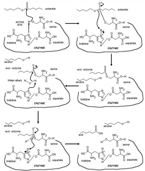 A mechanism that explains the action of hydrolases (e.g., depolymerase) in polyesters hydrolysis (synthetic and natural) through biodegradation is related to three amino acids, namely serine, histidine, and aspartate. A hydrogen bond is formed when a component reacts with the histidine ring, thus guiding interaction between histidine and serine, and forming an alcohol group of high nucleophilic character (-O). Histidine plays a deprotonating role for serine, i.e., as a base. The alkoxide group includes an ester bond and generates an acyl-enzyme and an alcohol group. Finally, a free enzyme and a terminal carboxyl group are generated by the action of the water molecule under an acyl-enzyme. This entire enzymatic degradation process is termed catalytic triad [,,], and the products generated are metabolized or not by microorganisms that have depolymerizing enzymes. Therefore, a consortium of microorganisms is important for complete biodegradation []. Figure 1 depicts the mechanism of action of depolymerizes and the catalytic triad.