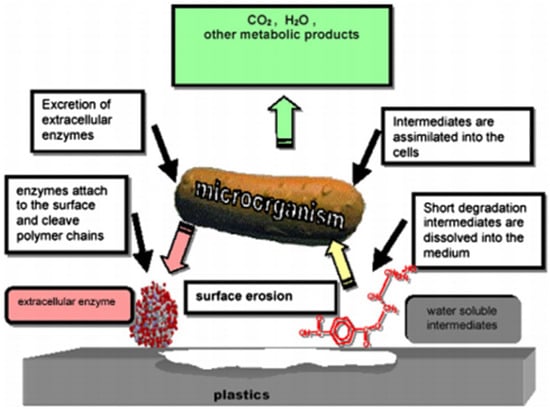 The result of biodegradation, for example of bioplastic from natural polymers (e.g., polysaccharides) is the generation of small molecules from a polymer. Microorganisms cannot employ large substances insoluble in water for obtaining organic or inorganic nutrients for their metabolism. They produce enzymes and chemicals used in extracellular environments and, therefore, depolymerize the materials. After hydrolysis and/or oxidative action of microorganism enzymes on different polymers, which results in monomers, metabolism oxidation occurs. In this system, organic compounds lead to a loss of electrons and the consequent production of ATP molecule (adenosine triphosphate). This is the last biodegradation stage, in which organic matter is mineralized. The microorganisms use smaller and simple organic molecules, such as oligomers and monomers, for their metabolic activities. However, byproducts are generated from microbial metabolism (e.g., carbon dioxide—aerobic degradation), water, biomass, methane, and hydrogen sulfide (anaerobic degradation) [,]. Figure 3 displays the biotic and abiotic degradation of plastic.