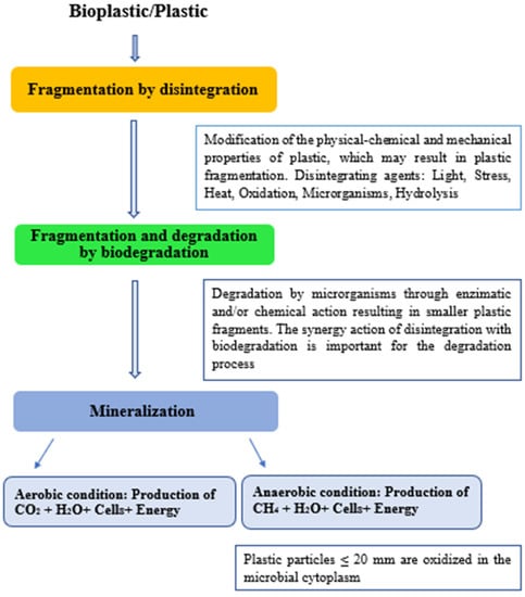 Disintegration, biodegradation, and mineralization process of plastic polymeric materials. Adapted [].
