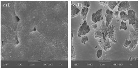Biodegradation due to physical degradation occurs from the adhesion of microorganism species to the surface of organic materials through the secretion of a gum [] produced by microorganisms. This gum represents a complex matrix made of natural polymers (e.g., polysaccharides and proteins). Such a thick complex, together with microorganisms, infiltrates the material and changes its volume, size, pores distribution, moisture content, and thermal transfers. A few microorganisms (e.g., filamentous fungi) lead to cracks in the materials due to mycelial growth, i.e., both their durability and resistance properties are reduced [,]. Microorganism biofilms are a matrix that protects microorganisms from different environmental conditions and results in a major change in materials [,].