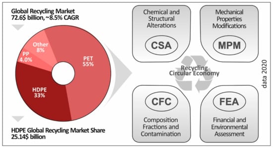 Current research in the field seeks to optimize and improve the properties of recycled polymers and especially those of polyolefin [,,,,,,]. Regarding the 3D printing of thermoplastics and recycled thermoplastics, there are several studies available that focus on the mechanical properties of fused filament fabrication (FFF) specimens [,,], while the studies on recycled additive manufacturing materials in general are very limited []. Regarding the recycling of HDPE, this study presents a global recycling circular economy model (Figure 1) with the four main parameters affecting the process of recycling. All these parameters are crucial for the economy of the recycling process and the material’s behavior after it is recycled.