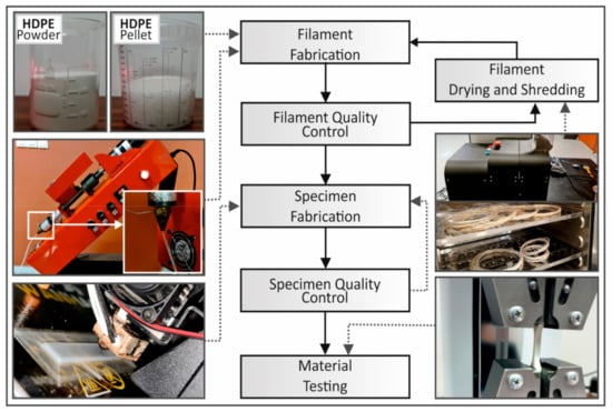 For the current research project, all the process steps are depicted in Figure 2 below. Initially, HDPE powder was used to produce virgin HDPE filament via extrusion processing. The produced filament passed through extensive quality control inspection to ensure a stable diameter of 1.75 mm and a smooth surface finish. Part of the initial HDPE filament was employed to produce specimens via FFF. Specimens were comprehensively evaluated and analyzed regarding their dimensional stability and their physical properties (i.e., color, surface finish, structural faults). Tensile, flexion, impact, and micro-hardness experiments were conducted in accordance with international standards to evaluate the mechanical properties of the 3D printed virgin HDPE specimens. Additionally, parts of the specimens were used to study thermal properties and changes of the virgin and the recycled HDPE and to perform a morphological characterization analysis.