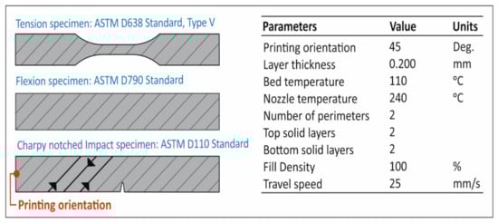 For the experimental procedures and testing, fused filament fabrication specimens were manufactured using the same 3D printing parameters (as shown in Figure 3) on a Wanhao Duplicator i3 3D printer (Wanhao Ltd., Zhejiang, China). All specimens were tested for the determination of their physical/mechanical properties in room temperature of 23 °C.