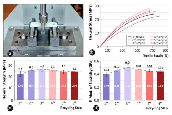 More specifically, Figure 5a depicts the flexion experimental setup, while Figure 5b shows the flexure stress vs. strain curves of a specific specimen from each recycling step (in all cases, specimen 2 was selected). Figure 5c presents the average value and the deviation of the flexural strength results for all the recycling steps, while Figure 5d depicts the average value and the deviation of the flexural modulus of elasticity values for the recycling steps.
