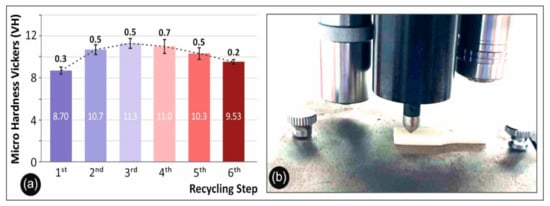 Regarding the micro-hardness testing, the average value and deviation of the Vickers micro-hardness for all the recycling steps studied is shown in Figure 7a, while the Vickers micro-hardness experimental setup is depicted in Figure 7b.