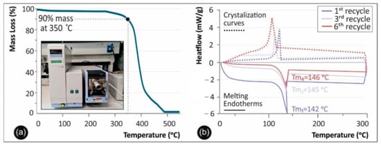 Differential scanning calorimetry (DSC) was also performed to obtain information about the effect of recycling on the melting point (Tm) and the shift in the degree of crystallinity of the samples. The measurements were taken via a Perkin Elmer Diamond DSC (Waltham, MA, USA) with a temperature cycle of 50 °C to 300 °C with a heating step of 10 °C/min and then cooling back down to 50 °C. The heating was performed on air.