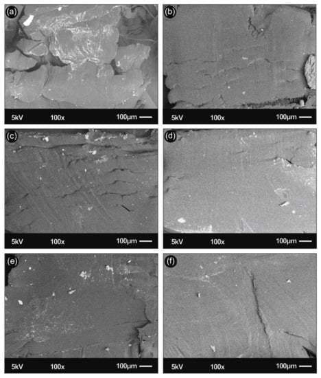 SEM images of the tensile specimens’ internal area at the neck of the (a) first recycling step; (b) second recycling step; (c) third recycling step; (d) fourth recycling step; (e) fifth recycling step; and (f) sixth recycling step.