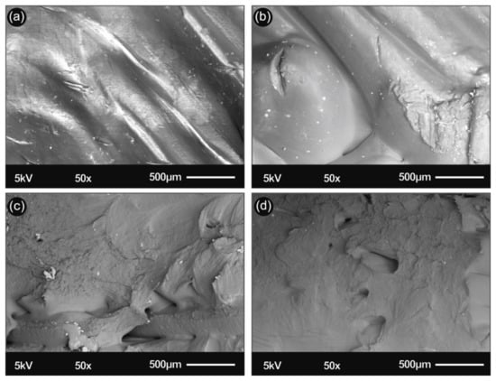 When observing the fracture areas of the impact specimens of the first recycling step (Figure 10a,c) and the sixth recycling step (Figure 10b,d), it was observed that the virgin FFF specimens behaved more ductile than those of the sixth recycling step, which broke in a more brittle manner. This was derived from the “peaks”, the “craters”, and the micro-fibers that were visible on the first recycling step specimen in Figure 10c and that were significantly less visible on the specimen of the sixth recycling step (Figure 10d).
