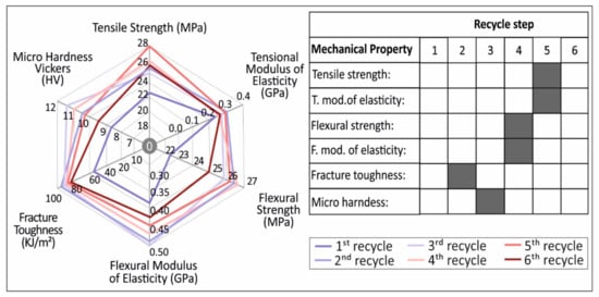 Figure 11 below summarizes the overall results of this study. The complete results of this research showed that each recycled course increased the mechanical strength of the virgin HDPE material. More specifically, regarding the tensile strength results, it was shown that there was an 23.13% increase in the tensile strength when comparing recycling steps first to fifth. The same increase was present on the tensile modulus of elasticity with a value of 27.26% between the first and the fifth recycling step. Literature reports a tensile strength value of 30.2 MPa on virgin HDPE injection molded specimens, while the recycled specimens had no difference in the tensile strength [].