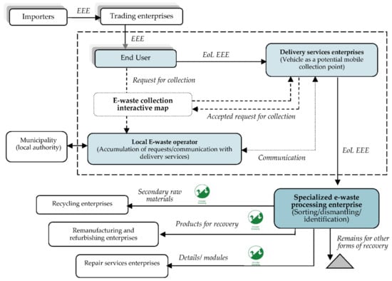 In order to launch and technically maintain the smart e-waste reverse system, it is advisable to create a local e-waste reverse operator at the specialized processing enterprise. The local operator will play a principal role in the system of reversing EoL/obsolete EEE since it becomes the connecting link between (1) the EoL EEE holder (end-user) and the delivery service vehicle as potential e-waste collector, (2) the local authority and the local delivery service enterprises involved in e-waste collection, and (3) the local delivery service enterprises and the specialized e-waste processing enterprise.
