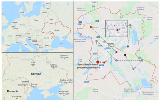 Figure 2 shows the conditional interactive online map of users’ requests to collect e-waste in Sumy city (Ukraine) and the conditional route of the delivery service vehicle. Under the outlined route, the vehicle collects e-waste according to the requests marked by users on the map and transports these wastes to the local specialized processing enterprise, with almost no deviation from the planned route.