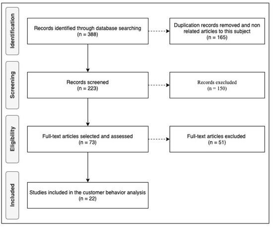 Figure 1 summarizes the selection criteria based on Snyder’s [26] process of conducting a literature review inspired by Preferred Items for Systematic Review Recommendations (PRISMA) [27] for selecting the most appropriate studies for this review. The selection criteria started by removing all duplicate papers and papers that were not related to this review from 388 papers collected from different databases. Next, we screened the titles and abstracts of the papers discussing RSCM, waste issues, and consumer behavior, which left 223 papers. We then did another screening focused on papers published between 2004 and 2021, with the majority published in the last five years; this phase resulted in 73 papers. Finally, using studies on understanding and analyzing customer behavior with a focus on recycling, we collected a final sample of 22 papers.