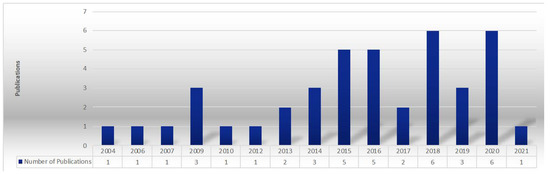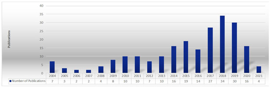 Figure 2 presents the number of publications related to RSC and waste issues from 2004 to 2021 in chronological order. The most publications were recorded in 2018, and since then, the number of those focused on RSC started to decline. The low number of publications recorded in this domain in 2020 shows the importance of further investigating RSC and waste issues. Figure 3 summarizes the published findings in mobile/smartphone recycling; the scarcity of studies highlights the importance of future research into mobile phone device waste.