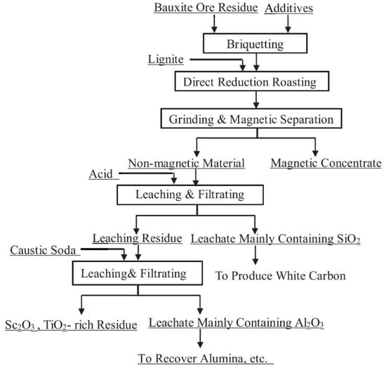 - Deng, B.; Li, G.; Luo, J.; Ye, Q.; Liu, M.; Peng, Z.; Jiang, T. Enrichment of Sc2O3 and TiO2 from bauxite ore residues. J. Hazard. Mater. 2017, 331, 71–80. [Google Scholar] [CrossRef] [PubMed]