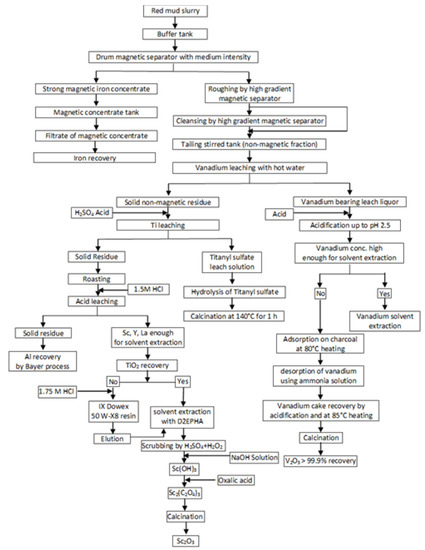 - Zhu, X.; Li, W.; Tang, S.; Zeng, M.; Bai, P.; Chen, L. Selective recovery of vanadium and scandium by ion exchange with D201 and solvent extraction using P507 from hydrochloric acid leaching solution of red mud. Chemosphere 2017, 175, 365–372. [Google Scholar] [CrossRef] [PubMed]