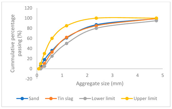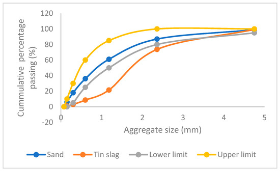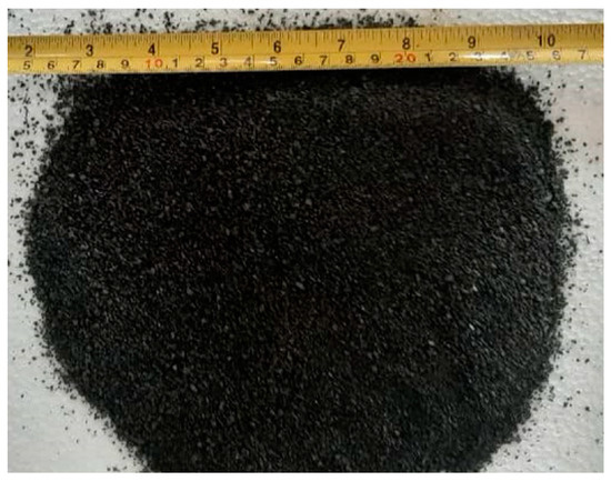 The materials used in this study were cement, NFA, TS, and water. TS was used as a replacement material of fine aggregate in different weight fractions. Ordinary Portland cement (OPC) with a gauge of 42.5 and a specific gravity of 3.14 according to ASTM C (American Standard Testing Methods) 150 [15] was used. NFA and TS of a 4.75 mm maximum aggregate size were used. The TS used was obtained from the tin smelting company in Penang, Malaysia. Tap water was used for the mixing and curing of the mortar specimens. The physical and chemical properties of the fine aggregate were measured according to ASTM C128 [16] and presented in Table 1 and Table 2. The shape characteristics showed that the fine aggregate particles were round and smooth, whereas the TS particles were elongated and rough-surfaced. TS particles at the macro state are depicted in Figure 1.