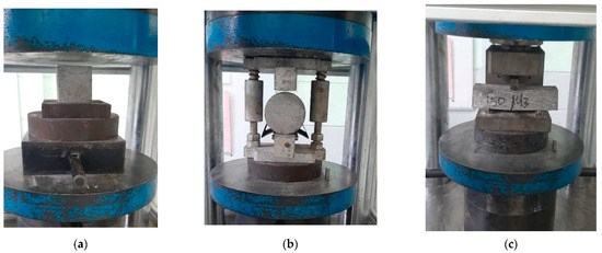 Hardened state tests: (a) the compression test, (b) the split tensile test, and (c) the flexure test.