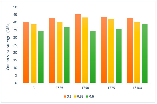 In this section, the 28-day compressive strength of graded TS mortars with different w/c ratios are presented and compared to the control sample. In addition, the compressive strengths of the TS cement mortar and control samples obtained at days 3, 7, and 28 are presented to check the early strength of the TS cement mortar samples. Figure 10 shows the 28-day compressive strength of mortar mixes at different w/c ratios. In all samples (control and TS), It was observed that, as w/c increased, the compressive strength decreased. The compressive strength decreased by as much as 25% due to the increased w/c ratio. For example, at TS50, the compressive strength decreased from 45.42 MPa to 34.22 MPa when the w/c ratio increased from 0.5 to 0.6. This result is consistent with previous findings [32,33]. However, to achieve good workability, mortars must not exhibit segregation or bleeding. Samples with a w/c ratio of 0.5 had the highest compressive strength but were too stiff; thus, their use is not practicable. Additionally, mortars with a w/c ratio of 0.6 were most workable, but segregation and bleeding were noticed, as was low compressive strengths (Figure 6). Contrarily, bleeding and segregation did not occur in mixes with a w/c ratio of 0.55 Thus, mortar mixes containing a water to binder ratio of 0.55 were selected based on their workability and strength. Compressive strength development is presented in Figure 11. However, both ungraded and graded TS mortar samples were tested for compressive strength to evaluate the influence of grading, as workability results showed differing trends (as shown in Figure 7 and Figure 8).