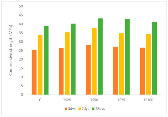 Figure 11 shows the compressive strength development of mortar samples with a w/c ratio of 0.55 after 28-days of curing. All fine aggregate replacements with graded TS increased the compressive strength of cement mortar on all curing days (3, 7, and 28). For example, the 3, 7, and 28 days compressive strengths of the control sample were 25.43 MPa, 33.87 MPa, and 38.75 MPa, respectively, whereas the TS samples’ lowest values were 26.35 MPa, 34.5 MPa, and 40.2 MPa, respectively. The increase in strength was due to the improved bonding provided by the TS’s aggregate angularity and surface roughness. Furthermore, as TS increased in the cement mortar, the compressive strength also increased. This compressive strength increase peaked at 50% replacement (TS50), while further increase in TS quantity decreased the compressive strength of the TS mortar. For example, at 28 days, when TS increased from 25% (TS25) to 50% (TS50), the compressive strength increased from 40.2 MPa to 43.15 MPa. Thereafter, this value decreased to 42.99 MPa and 41.12 MPa as TS increased to 75% (TS75) and 100% (TS100), respectively. The decrease in compressive strength is attributed to the reduction of aggregate hardness as TS% increased to 75% and 100% [34].