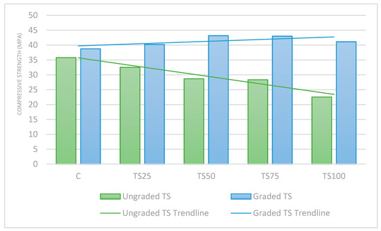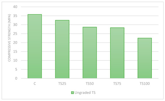 A different trend was observed with the ungraded TS (Figure 12). A progressive reduction in the compressive strength was noticed, even at 50% replacement, which had the highest compressive strength for graded TS.