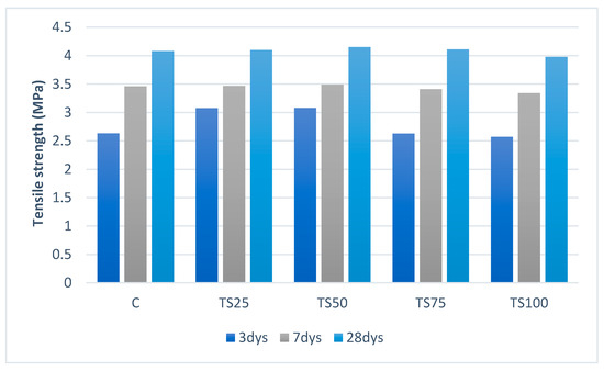 Cement composites such as mortar are generally weak while in tension. Under tension, the ITZ bears the tensile stresses for the matrix to be together. The strength of the ITZ is much weaker than that of the aggregates; thus, disintegration occurs as tensile stresses increases beyond the ITZ strength. Figure 14 shows the tensile strength of graded TS mortar samples with a w/c ratio of 0.55 at 3, 7, and 28 days. The tensile strength increased as number of curing days increased. For example, for TS25, when number of curing days increased from 3 days to 28 days, the tensile strength increased from 3.08 MPa to 4.1 MPa. The tensile strengths obtained at 28 days were similar for all the TS and control samples. The control sample C, TS25, and TS50 achieved tensile strengths of 4.08 MPa, 4.1 MPa, and 4.15 MPa, respectively. Similar findings were observed after 7 days of curing in all considered samples. However, after 3 days of curing, the tensile strength increased for TS25 and TS50, but decreased to values close to the control sample C. The 3-day tensile strength increased from 2.63 MPa for TS0 up to 3.08 MPa for TS50, and afterwards there was a decline to 2.62 and 2.57 for the TS75 and TS 100 mortars, respectively. The higher tensile strength observed in the TS50 mix was due to the greater contribution of the hardness effect by natural sand and the bonding effect in TS when compared to other mixes. However, Waheed [38] observed a significant 35% increase in concrete strength over the control, when 20% of TS was used for sand replacement. Therefore, the gains in strength in relation to aggregates might slightly differ from mortar because of the involvement of coarse aggregates in concrete.