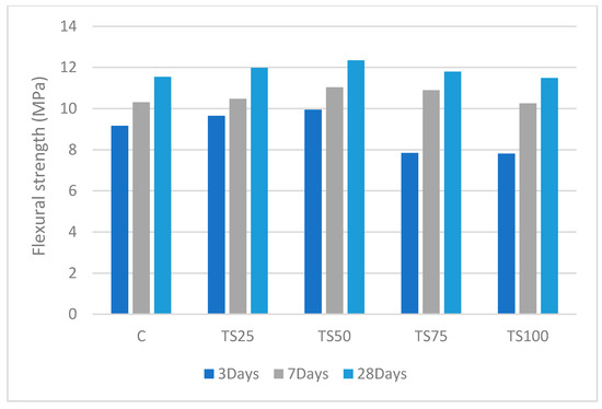 Flexural strength is sensitive to the aggregate type and little variations in specimen preparation and testing. Figure 15 shows the results of the flexural strength test of the graded TS mortar samples. The test was conducted on the TS and control samples after 3, 7, and 28 days of water curing. It was observed that, as the curing days increased, the flexural strength increased for the control and for all TS samples. Flexural strength gain of 11% to 15% was recorded from 7 to 28 days curing periods across all replacement levels. In addition, it was observed that the flexural strength increased as TS levels increased up to 75%, but peaked at 50%. However, a further increase in TS (TS100) resulted in decreased flexural strength. At 28 days of curing, the flexural strengths of TS25, TS50, TS75 and TS100 were 12.00 MPa, 12.35 MPa, 11.79 MPa and 11.48 respectively, whereas the control sample was 11.54 MPa. This shows that compressive strength at all replacement levels up to 100% were comparable to the control. The bond properties of the TS mortar matrix are influenced by the irregular and elongated aggregate shape.