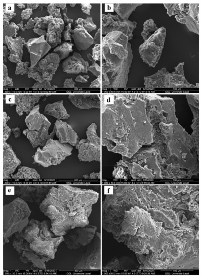 SEM images at different magnification of GTR particles: (a,b) 0–250 μm, (c,d) 250–500 μm, and (e,f) 500–850 μm.
