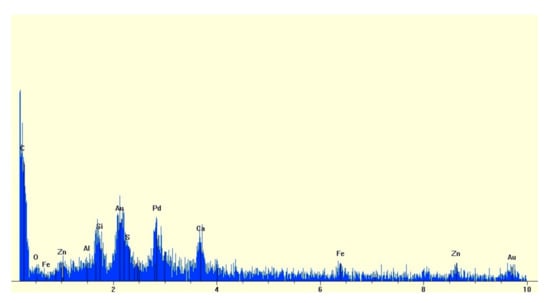 Figure 1 presents SEM micrographs of the GTR particle at different magnifications. Figure 1b,d,f illustrate the presence of considerable amounts of impurities, due to the recycled origin of GTR. As shown in Figure 2, the EDS image illustrates the presence of metals or other additives related to several materials used for the reinforcement of tire parts resulting in some impurity in GTR. Moreover, several sources of waste tires and grinding methods are responsible for various shapes like porous or smooth angular surfaces on the GTR particles. Due to the heterogeneous nature of recycled rubber particles, it is difficult to obtain a specific size and distribution. However, mechanical sieving is simple and cost-effective to achieve a good separation of each particle size selected (60, 35, and 20 mesh). The SEM micrographs show that the sieved materials are in the range of less than 250 μm (Figure 1a), up to around 500 μm (Figure 1b) and up to 850 μm (Figure 1c).
