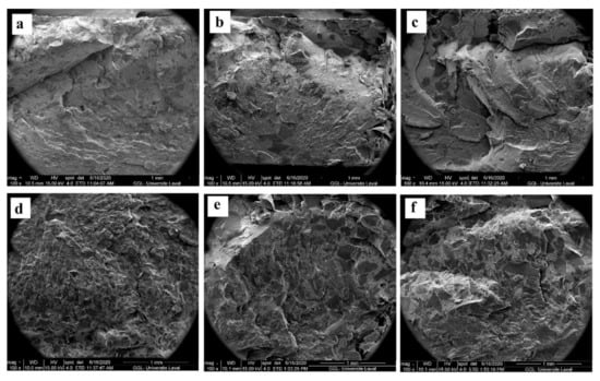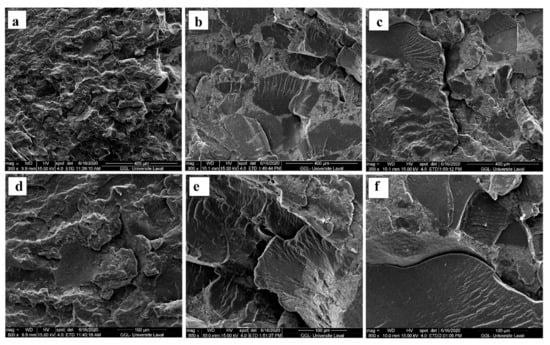 SEM micrographs of the fractured surfaces of: (a,d) GTR50S, (b,e) GTR50M, and (c,f) GTR50L. See Table 3 for definitions.