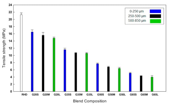 Larger GTR particles also increase the probability of GTR agglomeration and the formation of larger voids around them, while smaller particles will develop smaller cracks [14]. Colom et al. [15] observed that adding 20 wt.% GTR (200 μm) decreased the tensile strength of HDPE by 25% (from 24 to 18 MPa), while an acid treatment (sulphonitric) of GTR showed only a decrease of 13% (from 24 to 20.8 MPa). They concluded that this chemical surface treatment (etching effect) led to increased surface roughness modifying the interaction with the matrix producing better blends with higher tensile properties, especially for smaller particles (<200 μm).