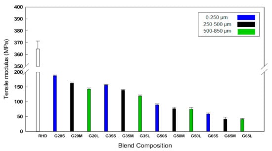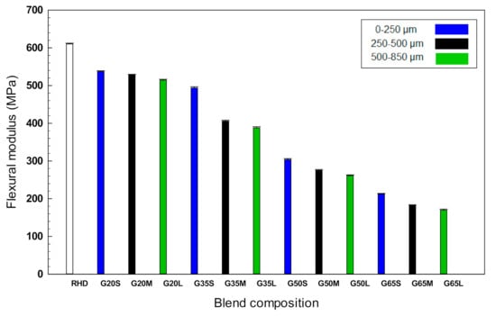 The flexural modulus is presented in Figure 8. As expected, the values decrease with increasing GTR content as for the tensile modulus (Figure 6). For example, increasing the GTR content from 35 to 50 wt.% deceased the flexural modulus of G50S, G50M, and G50L by 33% (201.8 to 133.6 MPa), 35% (175.9 to 115.1 MPa), and 40% (164.9 to 98.1 MPa), respectively. This can be related to the presence of a low modulus GTR phase (low stiffness) in rHDPE and interfacial voids/defects inside the blends (Figure 3 and Figure 4). The mechanical properties strongly depend on the filler dispersion (GTR) and interfacial interaction controlled by both the GTR content and particle size. Lower flexural modulus is also observed by using larger GTR particle (500–850 μm). For example, the flexural modulus of G35S, G35M, and G35L is 201.8, 175.9, and 164.9 MPa, respectively. Again, higher flexural modulus using smaller particles is attributed to better interfacial interaction (higher specific surface area) between the small particles and the thermoplastic molecules leading to fewer structural defects.