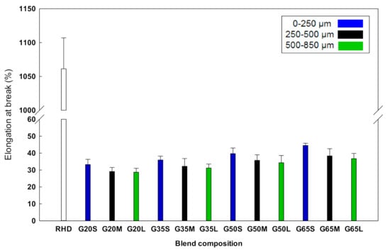 It is found that the effect of filler particle size on tensile properties at lower GTR content (less than 50 wt.%) is more important, while poor interfacial interaction is the main factor controlling the tensile properties of TPE at higher GTR content [26]. Finally, particle sizes smaller than 500 μm produce better mechanical properties compared to larger ones attributed to the higher specific surface area of the former, promoting better interfacial stress transfer and interaction between GTR and rHDPE [11,27].