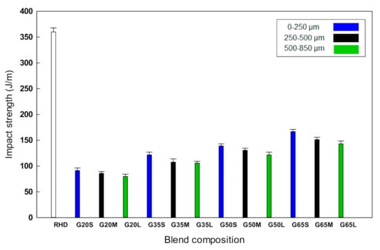 Figure 9 presents the impact strength showing the effect of GTR content and particle size on toughness. The addition of GTR decreased the impact strength of the neat rHDPE (360 J/m), due to low compatibility between the recycled crosslinked rubber particles and the thermoplastic phase, since the rubber molecules do not have enough freedom to entangle with the rHDPE molecules and create strong bonding [28]. This behavior can also be related to the presence of carbon black, causing defect points inducing a split in the layer structure of the rHDPE/GTR blend, providing a shorter path for fracture propagation, producing lower impact strength [29]. Despite lower rHDPE toughness with GTR addition, increasing the recycled rubber content from 35 to 50 wt.% slightly improved by 14% (121.5 to 138.9 J/m) the toughness of blends filled with small GTR particles (0–250 μm). This can be attributed to the crosslinked structure of the GTR, making the particles more deformable to absorb more energy before crack initiation. In our case, smaller particles lead to an increased toughness. For instance, G35S showed higher impact strength (121.5 J/m) compared to G35M (107.6 J/m) and G35L (105.7 J/m). This can be explained by high interfacial tension between GTR and rHDPE leading to GTR particles cluster/agglomeration and the formation of voids around large GTR, increasing the number of defects, voids, and cracks. On the other hand, smaller GTR particles (higher specific surface area) were more easily dispersed into the matrix, and improved interaction was produced between GTR and rHDPE [21].