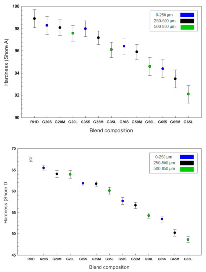 In general, the hardness of a TPE compound is influenced by the elastic modulus and crosslink density of the rubber phase (GTR) [5]. Figure 10 shows that the variation of TPE hardness as a function of GTR content and particle size follows a similar trend to that of the modulus (Figure 6) [4,30]. A reduction in hardness (Shore A and Shore D) is observed as the rubber content increases from 20 to 65 wt.% for all GTR particle sizes attributed to the presence of a higher content of a soft elastomeric component (GTR) in the rigid matrix (rHDPE). For example, increasing the GTR content (0–250 μm) from 35 to 50 wt.% decreased the Shore A hardness by 3 points (from 98 to 95) and the Shore D by 4 points (61 to 57). The results also show that hardness increased along with the recycled rubber particle size for a fixed blend composition (50 wt.% GTR). Increasing the GTR particle size from 0–250 μm to 250–500 μm, and 500–850 μm resulted in lower hardness from 57 to 56 and 54 (Shore D), respectively. In agreement with similar reports, using small GTR particles (0–250 μm) produced higher hardness, due to higher chain mobility restriction and blended rigidity as a result of a more uniform filler distribution and better interfacial interaction of small particles (high surface area) with the matrix [31,32].
