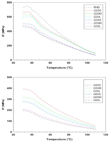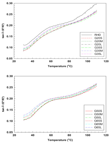 The storage modulus curves as a function of temperature can help to understand the stiffness of the polymer blends with respect to phase morphology and interfacial bonding. The storage modulus indicates the maximum energy that can be stored in a period of time and reflects the rigidity of materials [33]. Figure 11 shows the storage modulus (E’) as a function of temperature to understand the effect of GTR content and particle size on the stiffness of rHDPE/GTR blends. As expected, the higher E’ of the matrix compared to the blends is attributed to a semi-crystalline structure of rHDPE and the presence of crystallites offering relatively high stiffness [34]. As shown in Figure 11, increasing the GTR content up to 65 wt.% decreased the E’, which is associated with material softening by including soft rubber particles (low elastic modulus) in the rigid matrix, inducing lower rigidity [35]. Moreover, incorporation of small GTR particles (0–250 μm) led to higher rigidity (E’), due to a more efficient stress transfer between the phases as a result of better interaction between small GTR particles and rHDPE (Figure 3 and Figure 4). As reported before, higher specific surface area of smaller GTR particles can reduce the interfacial tension between each phase resulting in better interfacial interaction and higher modulus [19].