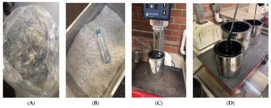 (A) Materials used in this research study of waste PET plastic; (B) plastic after grinding; (C) binder mixer using C320 bitumen; and (D) PET-modified C320 binders.