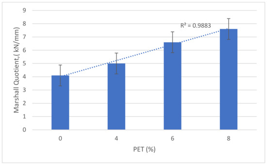 The Marshall tests were simply conducted to investigate the ability of asphalt to withstand failure and rutting deformation under a substantial load of traffic. The values of Marshall stability, Marshal flow and Marshall quotient are displayed in Figure 6, Figure 7 and Figure 8, respectively. As can be seen from Figure 6, the more waste plastic in the mixture, the higher the stability; therefore, the plastic-modified asphalt mixtures show better stability compared to the control mixture. The Marshall stability test is a well-known indicator of the resistance of bitumen materials to distortion, displacement, rutting and shear stress deformation [37]. The addition of plastic does result in a decrease in Marshall flow, as shown in Figure 7.
